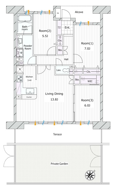 | 設備 | エレベーター オートロック 防犯カメラ 宅配BOX テラス 専用庭 アルコープ TVモニターホン システムキッチン ユニットバス 浴室に窓 浴室乾燥機 温水洗浄トイレ 洗面化粧台 クローゼット ウォークインクローゼット フローリング 室内洗濯機置場 ペット飼育可(細則有) |