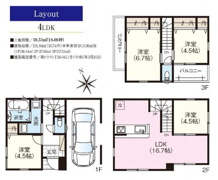 4LDK:101.64㎡(車庫部分13.36㎡含む)